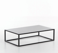 Tavolino basso in ferro verniciato nero con piano in plexi nero, design Csilla Gabor